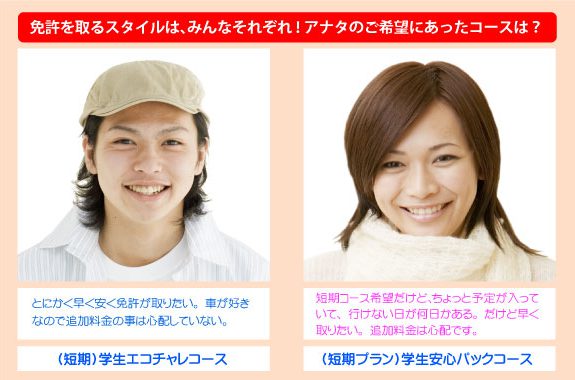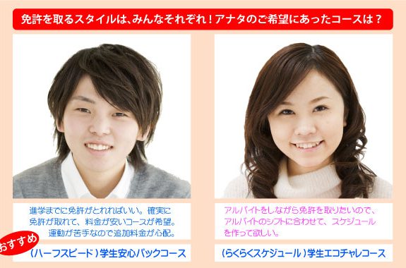 小野自動車教習所では、早く取りたい、アルバイトをしながら取りたいなど、お客様のご要望に合わせて取得できるよう、いろいろなコースを取りそろえています。