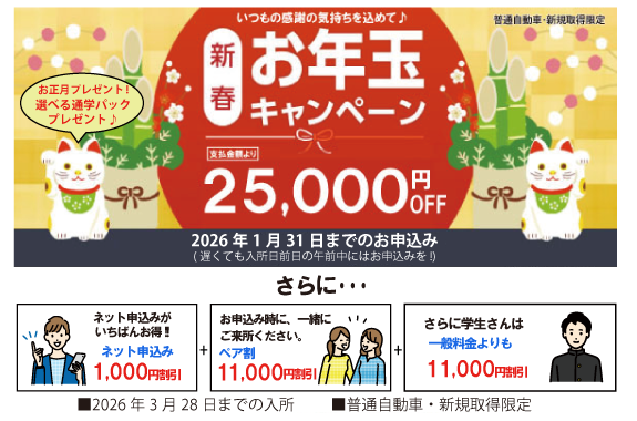 来所にて入所申込み時に「お年玉キャンペーン」と申し出てください。